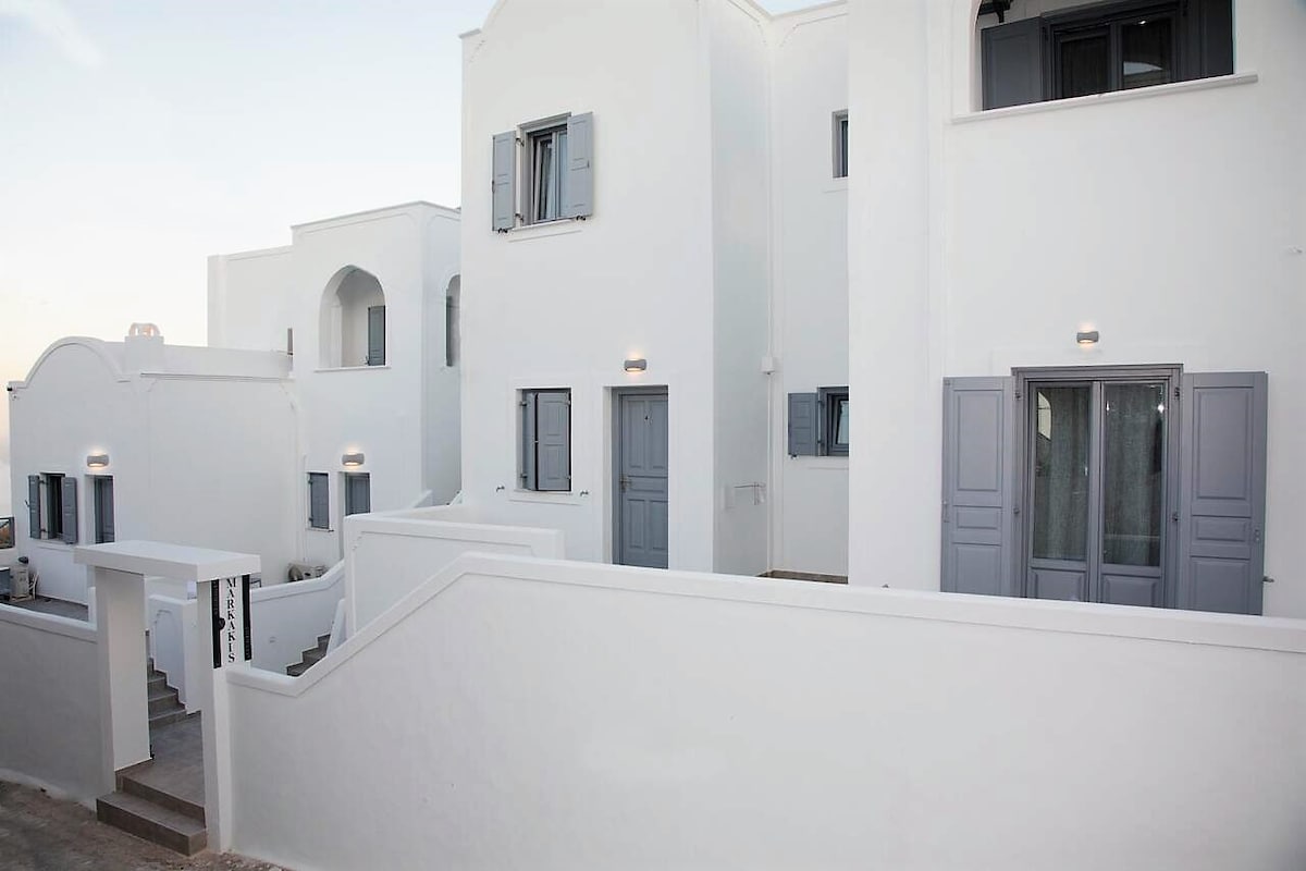 Абсолютно нові дизайнерські люкси з приватним гідромасажем на вулиці. Просторна, мінімальна, з однією спальнею, гостиною зоною, душовою кімнатою, міні-кухнею та приватним балконом з відкритою гідромасажною ванною. Розташована в центрі Фіри, пропонує швидкий і легкий доступ до вулкану з видом на закат, магазинів, ресторанів, кафе, барів, музеїв, банків, автобусної зупинки. Гості отримають безкоштовний швидкий Wi-Fi, додаток hitech smart TV/netflix, Bluetooth динамік Marshall