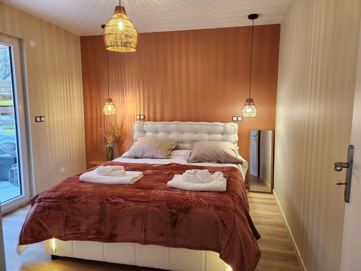 У зеленій зоні, невеликий незалежний будинок на 2200 м2 саду, віддалений від дороги, на краю лісу, на тій же землі, що й гості. Ми вітаємо вас у нашому прекрасному раю квітів, нашому раю миру чекає вас. 2 кімнати для розміщення, одна раковина та 2 дуже зручних ліжка, які ми збираємо разом для пари , інша вітальня, їдальня та міні-кухня з 2 ліжками, включаючи висувне ліжко, що робить диван дуже комфортним. Окремий душ, окремий туалет.