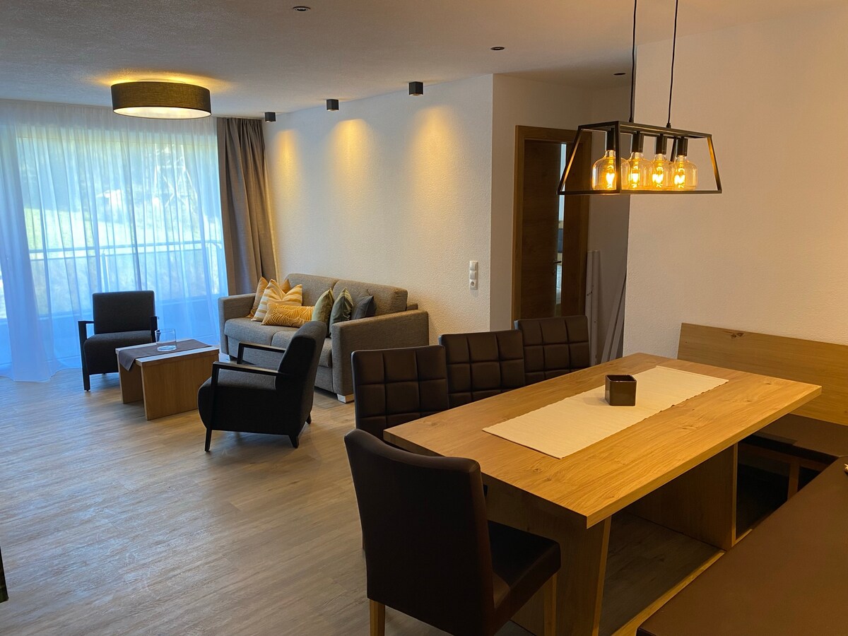 In meinem 2013 erbauten Haus befindet sich ein Appartement im Erdgeschoß (eigenem Eingang) mit sehr schönen Ausblick in die Berge. Einer grossen Terrasse, (im Sommer mit Gartenmöbeln ausgestattet) zum Verweilen und relaxen ein. Es besteht aus einem geräumigen Schlafzimmer mit großem Schrank und einem grossen, hellen Wohn/Essbereich inkl. Küche. Im Winter ist die Skibus Haltestelle ca. 100 m entfernt, das Haus ist am Waldrand gelegen in ruhiger Lage und doch alles zu Fuss (ca. 1 km) erreichbar