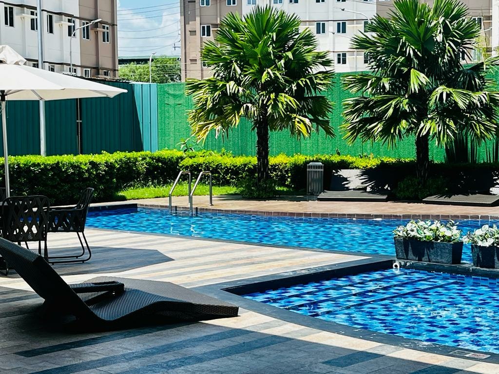 Затишна та комфортна студія, розташована в центрі SMDC Cheer Residences в Марілао, Булакан! Наш апартамент повністю мебльований і обладнаний усім необхідним для комфортного та приємного перебування, включаючи зручне ліжко розміру Queen size, диван-ліжко, телевізор із плоским екраном, обідній стіл, обідній стіл, міні-кухню з холодильником, мікрохвильову піч, електричний чайник та основний кухонний посуд, окрему ванну кімнату з гарячим і холодним душем, басейн, басейн, цілодобова охорона та стійка реєстрації та стійка реєстрації.