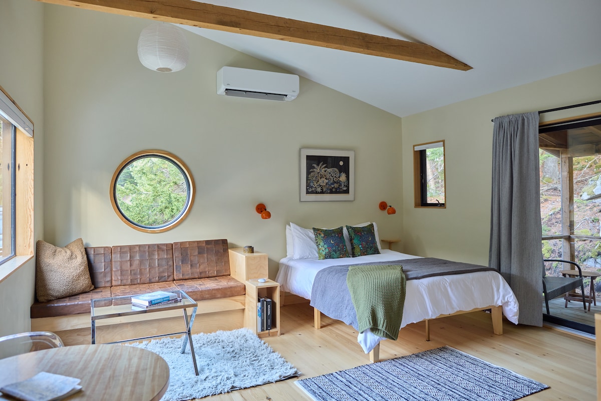Відпочиньте в Spruce Studio на 8 гектарах лісу зі ставком. *За кілька хвилин до пляжу парку штату Рейд і 5 островів🦞 * Місце для багаття зі смаколиками * Простирадла/рушники зі 100% бавовни * Тропічний душ і підігрів підлоги у ванній кімнаті * Кондиціонер/опалення та автоматичний генератор Kohler * SmartTV та програвач платівок з вінілом * Швидкий широкосмуговий Wi-Fi *Spruce Studio — одна з двох кают на наших 8 акрах прямо біля дороги від одного з найкращих пляжів у штаті Мен! Зруби розташовані на відстані 150 футів один від одного, розділені ширмою для приватності та природними насадженнями.