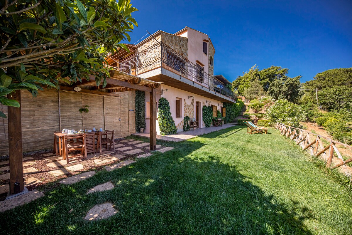 Immersa nel secolare uliveto dell'ex feudo Bordonaro, inserita in un esclusivo piccolo residence , la villa gode di accesso privato alla bellissima ed incontaminata spiaggia di Settefrati , luogo ricco di antiche leggende, da cui dista solo 250 metri. La casa ha tripla esposizione e si affaccia su patii arredati con mobili da esterno dove poter trascorrere piacevoli momenti di relax. La villa è circondata da un curato giardino con prato, da quest'anno impreziosito da una vasca idromassaggio