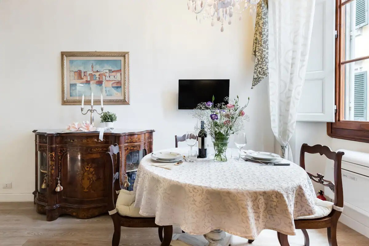 Відчиніть великі скляні двері, щоб впустити запах тосканських трав; вийдіть на терасу та відкуповуйте вино санджовезе, щоб насолодитися приголомшливим видом на Дуомо. Ця романтична квартира на даху, розташована на дахах автентичних районів Санта-Кроче та Сант-Амброджо, має абсолютно нову техніку, антикварні меблі та меблі ручної роботи, дві ванні кімнати та всі необхідні зручності для ідеальної бази для вивчення Флоренції.