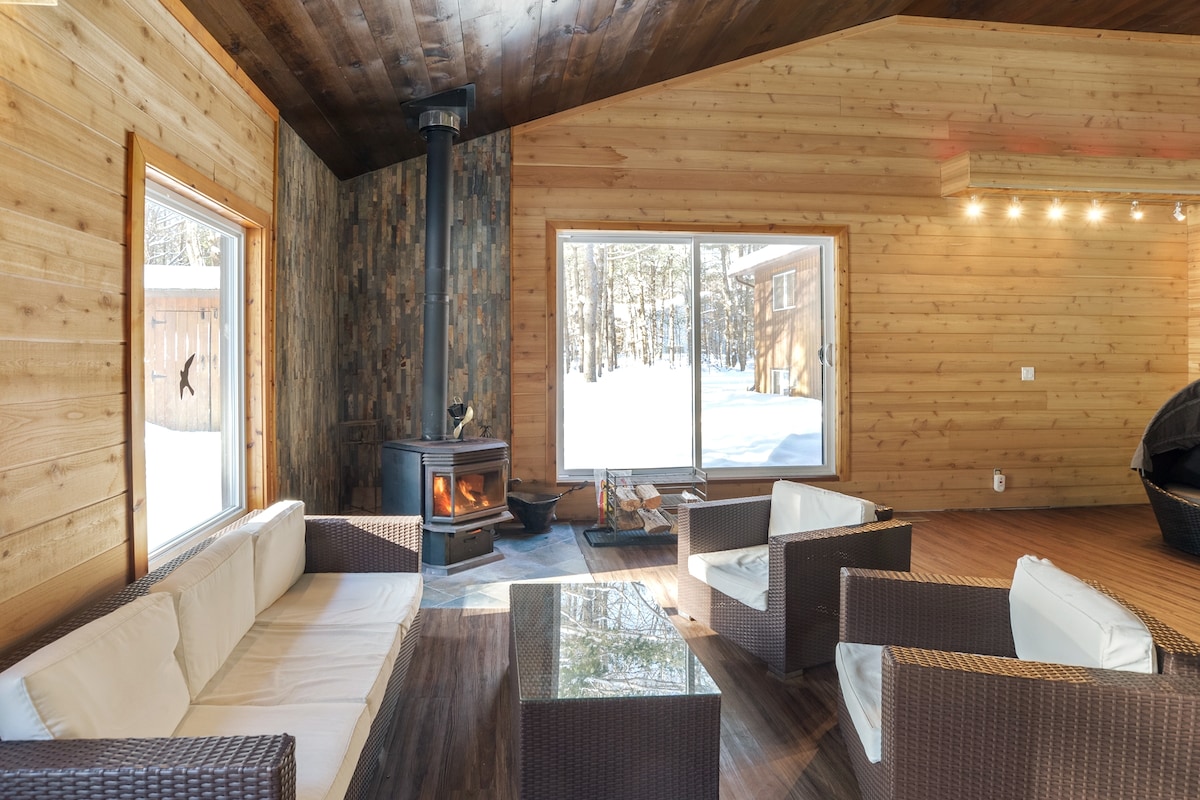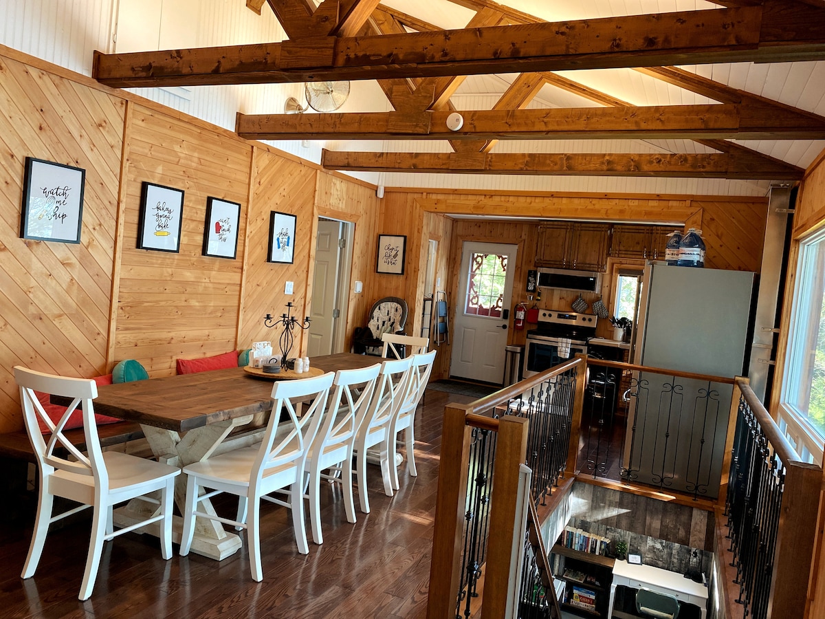 Чистота, сучасна, відкрита концепція, склепінчасті стелі, краєвид на кухню шеф-кухаря. 2 спальні з додатковим спальним місцем на нижньому рівні. 2 окремі ванні кімнати оснащені ванною в сокерному стилі та душовою кабіною, облицьованою плиткою. Природа рясніє! Чарівний ручей, вид на озеро, плавання, барбекю, їдальня на відкритому повітрі, вогнище** заборона на вогонь на квітень** цілорічна гідромасажна ванна. Велосипеди, байдарки та снігові черевики у вашому розпорядженні залежно від сезону. Недалеко від провінційного парку на озері Бальзам. Хвилин до сільських магазинів. Послідовний супергосподар!