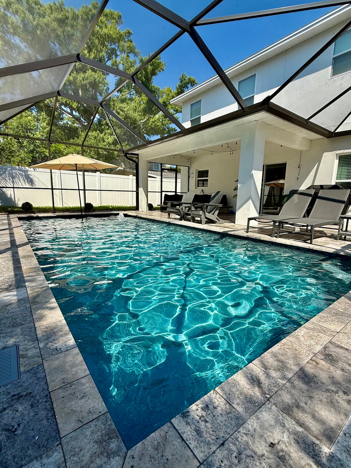 Приходьте насолоджуватися абсолютно новим, ретельно манікюрованим помешканням нашої сім 'ї в Pinecraft! Розташований на тихій тупиковій вулиці, але всього в декількох хвилинах від усієї Сарасоти. Наше помешкання з 5 спальнями - кожен з них є люксом з окремою ванною кімнатою - і розкішним, відкритим планом поверху - ідеально підходить для більших сімей або груп. Басейн з екраном та опаленням на приватному подвір 'ї, оточений пышною ландшафтною озелененням, - це затишне місце для відпочинку та спогадів! За хвилини від пляжу!