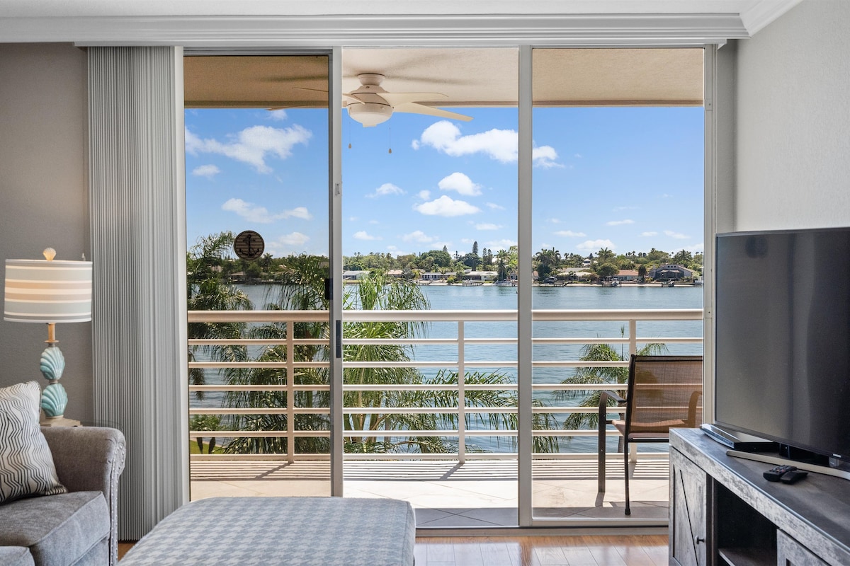 Pristine villa in the lovely seaside Gulf town of Indian Rocks Beach, 2 short blocks to the beach & the Intracoastal in your backyard. All newly renovated, both inside and out, enjoy unobstructed water views, private entrance, personal patio & your own indoor/outdoor fireplace. When you aren't lounging outside or taking a glide on our paddle board, you'll love the gourmet kitchen, comfy living room, two large TV's, cable/wifi, luxe memory foam king bed & secured safe.