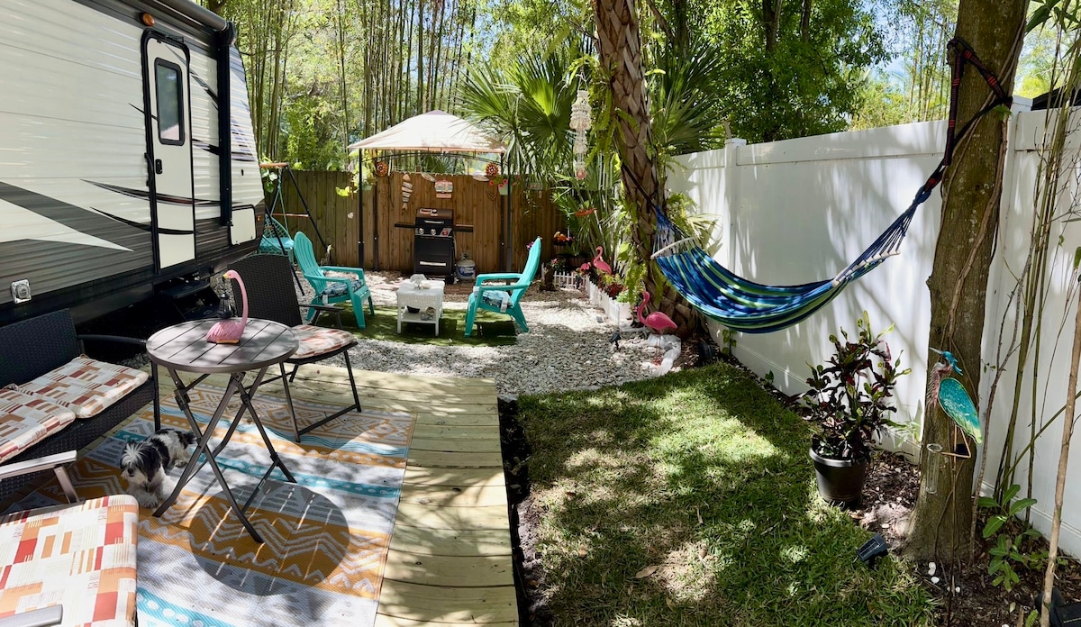 Ви не забудете час у цьому глемпінговому оазисі!! 34-футове п 'яте колесо на приватному боковому майданчику, підходить для королеви! Велика відкрита тераса з 76-дюймовою ванною для пар на відкритому повітрі з окремим та приватним душем на відкритому повітрі. Вбудований бар для їжі на вулиці. Красивий декор і пальми навколо, відпочиньте в 3 милях від НАЙКРАЩИХ пляжів на західному узбережжі та насолодіться природою, прогулюючись по стежці Пінеллас прямо в околицях. 20 хвилин їзди до центру Сент-Пітерсберга або до Тампа.