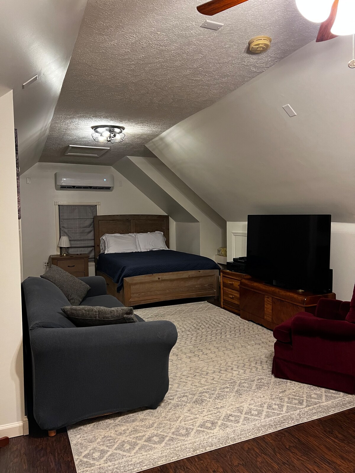 Кімната є окремою студією з міні-кухнею, затемнювальними шторами та ліжком розміру queen size. Вона має одне спеціальне паркувальне місце та окремий вхід. У помешканні є окрема ванна кімната, гардеробна та міні-кухня. Також є холодильник, кавоварка, робочий стіл, мікрохвильова піч, 42-дюймовий смарт-телевізор, повітряна фритюрниця Ninja та диван. Приватний ґанок зі столом і стільцями. Закрити/захистити одне паркувальне місце.