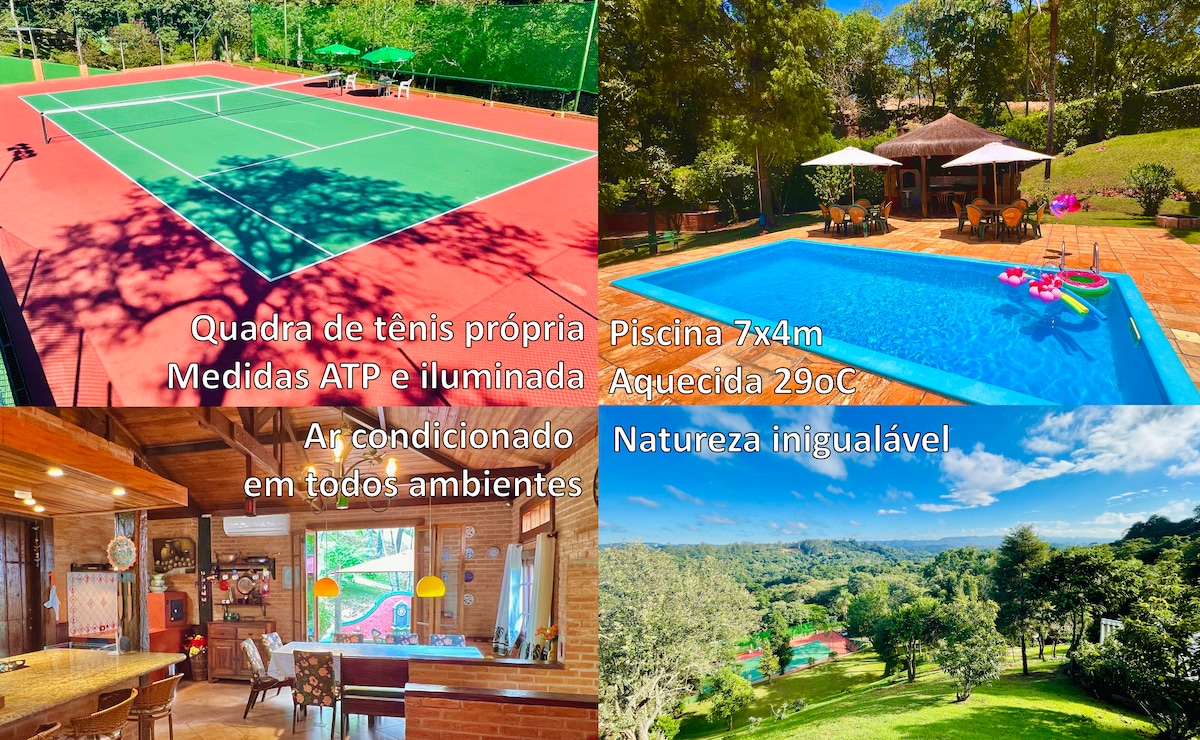 Ideal and private countryside retreat to relax and enjoy special moments with family and friends. Located in the Porta do Sol gated community with 24-hour security, the property features a heated pool with a hot tub, a fully equipped gourmet area with a barbecue, a Beach Tennis court, and a game room. The deck offers an incredible sunset view, and there’s also a charming Swiss-style chalet surrounded by flowers. The entire access is paved, and all bedrooms have AC. 5 km from Outlet Catarina.