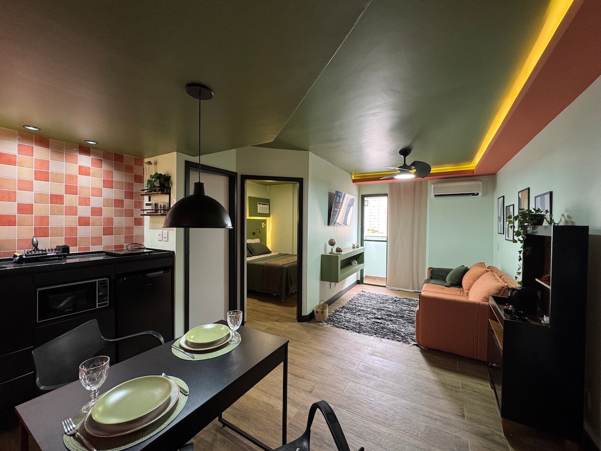 Наша студія площею 46 м² (495 кв. футів) розташована в чудовому місці в Бауру. Поблизу розташовані супермаркети, пекарні, бари та ресторани, а також Centrinho/Usp, CPO та FACOP. Це сучасний, затишний простір, повний стилю, комфорту та кондиціонера. Звичайно, ваше бронювання не забезпечить простого помешкання, а чудовий і чудовий досвід. У будівлі є цілодобова стійка реєстрації, тренажерний зал, коворкінг, басейн і пральня.