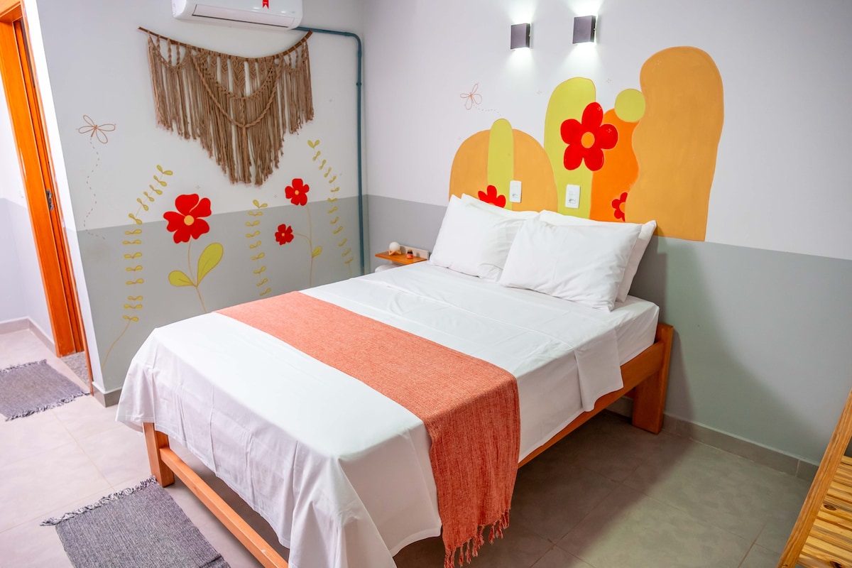 Um chalé privativo, iluminado e moderno, cercado por um jardim e mural de flora. O chalé possui Smart TV, cortinas blackout, banheiro, varanda com rede e mesa e uma ducha fora do chalé para se refrescar. A mini cozinha possui frigobar, cooktop de 2 bocas, utensílios, pratos e todo o básico para aproveitar o passeio. Traga as suas bebidas e alguns ítens de café da manhã! Oferecemos Wi-Fi, estacionamento próprio para 1 carro e 1 ventilador. Não oferecemos ár condicionado. Acomoda-se 1-2 pessoas