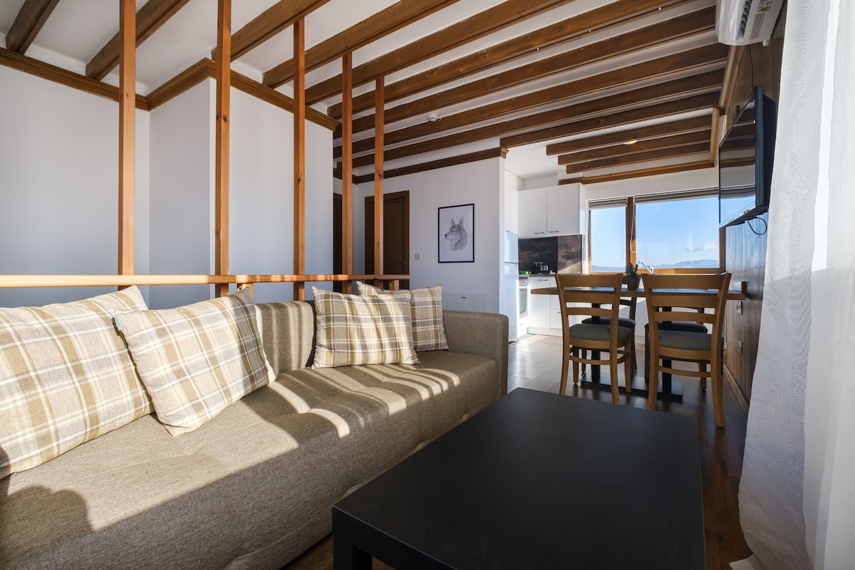 Унікальні апартаменти на верхньому поверсі з приголомшливим видом на 3 гори. Частина красивого гірського готелю, обійманого в незайманому лісі з невеликим струмком, що протікає неподалік. Разом із клубом верхової їзди цей райський рай подарує вам відпочинок і пригоди, які ви жадаєте, а свіже гірське повітря дозволить вам спати і відпочивати, як ніколи раніше.
