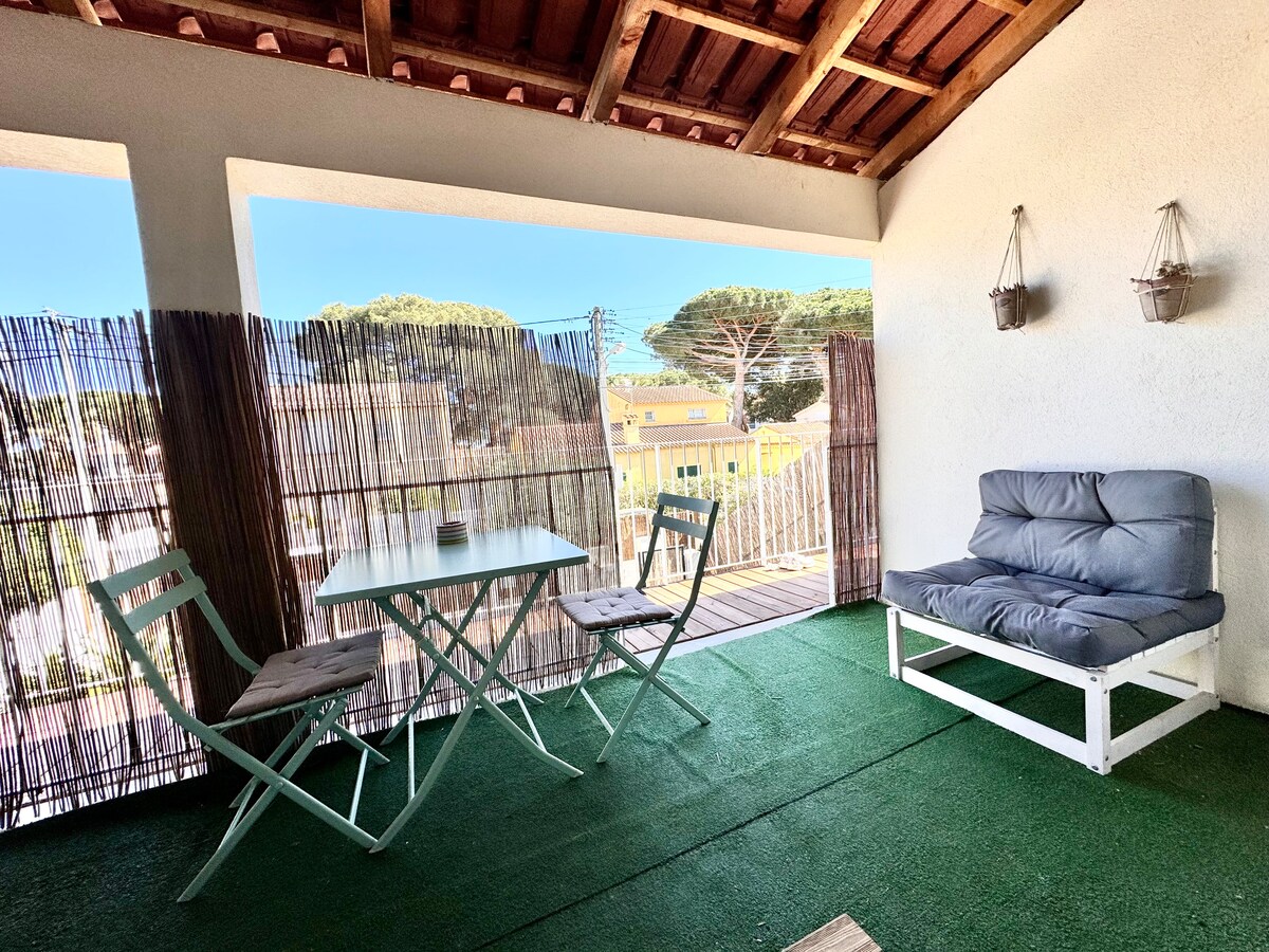 Joli T2 de 25m2,à 200 m de la plage, rénové CLIMATISATION installée avril 2026- véranda balcon sans vis à vis/quartier très calme/ 1er étage /proche piste cyclable et commerces du bord de mer : plage de l'Ayguade ,centre thalasso sur la presqu île de Giens à 3kms. Animaux non acceptés.Séjour avec canapé non convertible.Chambre vrai lit 140-cuisine équipée - place de parking - Draps et serviettes de toilettes NON FOURNIS (location possible).