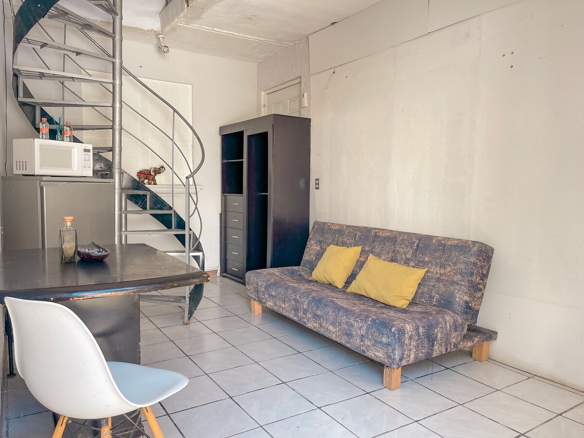 Departamento tipo loft totalmente equipado para gozar de una estadía realmente placentera y como en casa, diseño muy original y acogedor, una amplia terraza para tomar el sol y tener una rica tarde, ubicada cerca de cines, súper,farmacia y tienda de abarrotes frente al departamento, una zona tranquila de la ciudad, el lugar ideal para tener horas de descanso y/o trabajar sin el bullicio de estar en medio de la ciudad.