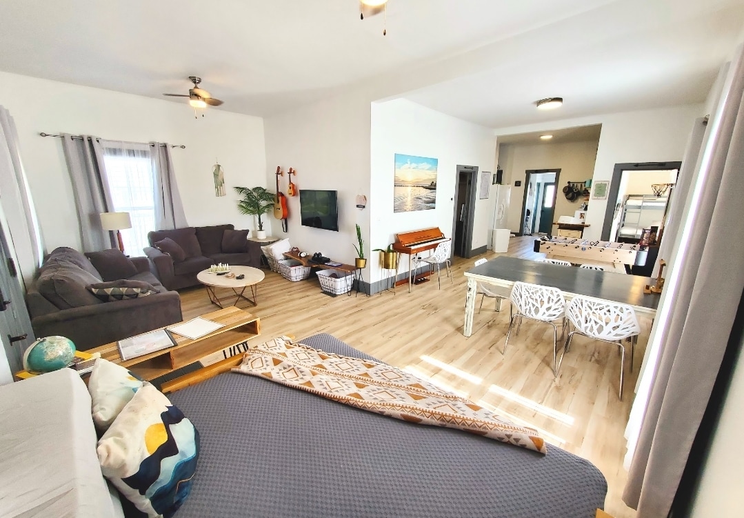 Peaceful, fun, open, intentionally designed 3 bedroom oasis in central Kearney, Nebraska. 🏡 King suite, Queen bedroom, Full over Full "Bunkhouse", Futon, 2 couches, twin floor bed & Queen Air Mattress Roku TVs & extra blankets in every room PS4 Foosball 🤙 Boho Hanging Egg Chairs Dining table seats 8 Coffee bar ☕️ Butcher block Full fridge & freezer Washer & Dryer Tons of games Privacy fenced yard w/ large deck, dining table, fire table, grill, & hammocks! Play & relax 🪴🏡🪴