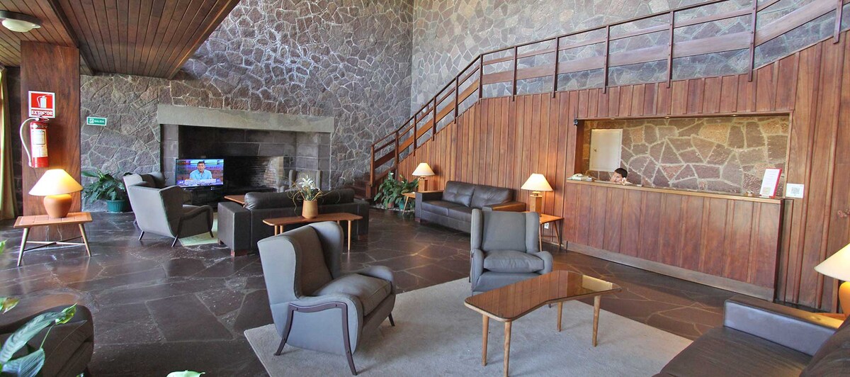 Чотиримісні номери з видом на природу. Дві суміжні кімнати: одна з двоспальним ліжком, а інша з двома односпальними ліжками, кондиціонером, Wi-Fi, смарт-телевізором, міні-баром, постільними речами, рушниками, туалетним приладдям, окремою повноцінною ванною кімнатою в обох кімнатах та робочій зоні. Готель у відмінному місці, з великими природними просторами, критим басейном з підігрівом та навченим персоналом для виняткового перебування. Сніданок входить у вартість вашого перебування та щоденна послуга покоївки!!!