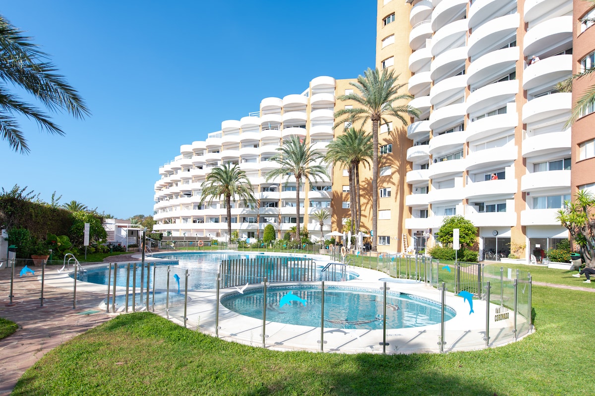 Красива повністю відремонтована квартира, ідеально підходить для відпочинку наодинці або як пара, з фронтальним видом на Середземне море та всю затоку Марбельї. Він розташований в житловому комплексі «Romana Playa» (Ельвірія, Марбелья) на пляжі та з прямим доступом до пляжу Ла-Вібора, в 2 хвилинах від пляжу Ніккі. Вона має двоспальне ліжко, диван, душову кабіну, крісла та вуличний диван на терасі, обідній стіл, кухню та велику шафу. Тиха обстановка. Ви також послухаєте морські хвилі.