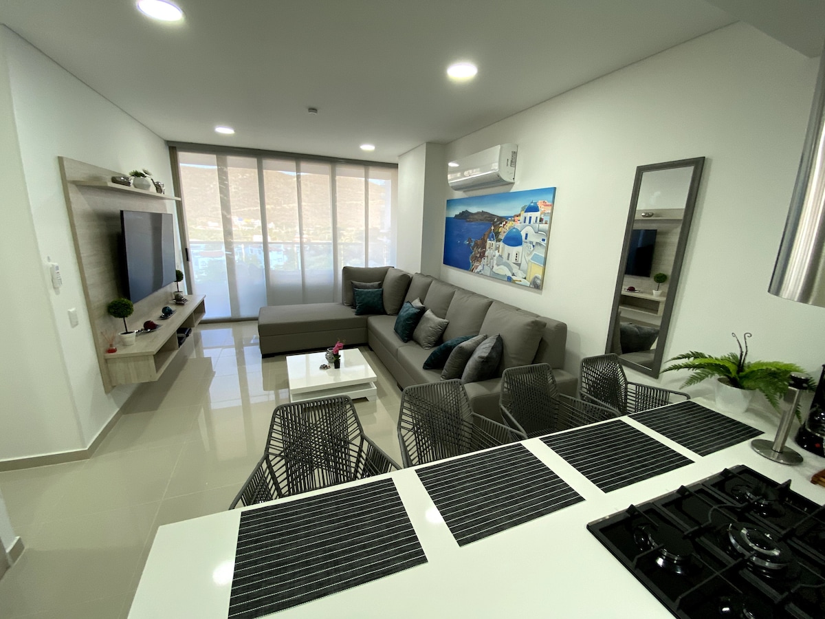 У ВІДПУСТКУ. 10 хвилин від аеропорту та 10 хвилин від центру Санта-Марти, чудовий клімат, де поєднуються вітри Сьєрри та Карибського моря. Прямий доступ до пляжу, басейни, ТРЕНАЖЕРНИЙ ЗАЛ, вологі зона, коворкінг, читальні кімнати, телевізійні кімнати, дружина, дитячий сад, ресторани. Підходить з обладнаною кухнею, пральною машиною, сушильною машиною, двумя спальнями, великою терасою, телевізором, кондиціонером і 3 великими ванними кімнатами. Одне ліжко Queen Size, одне двоспальне ліжко, 2 односпальні ліжка, двоспальне ліжко та двоспальний диван-ліжко
