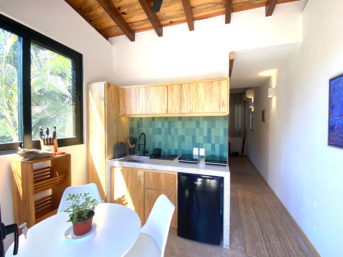 Romantic studio with panoramic ocean views in the tranquil north end of Sayulita a few blocks uphill from the beach. *Brand new, completed December 2022! *High speed wifi via Sayulitawifi *42" Smart TV *Air con, ceiling fans *Kitchen: stove, oven, microwave, blender, coffeemaker, all utensils *Breathtaking panoramic views *Queen bed, pillowtop mattress *Exterior double size sofa bed *Parking for 1 vehicle *Bathtub *Common area pool, grill *ocean view yoga studio with daily class *Gym