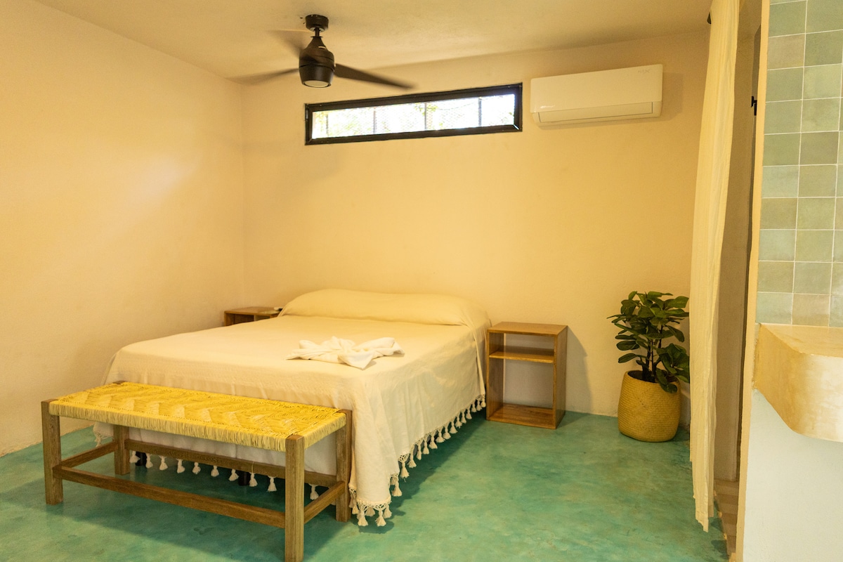 Студія для двох, трохи вище Плайя-Мансанільо, пляжу з найспокійнішою водою в Пуерто-Ескондідо. Кабанья, побудований поруч із басейном із приголомшливим видом на океан, має повністю обладнану кухню, сонячний душ з гарячою водою, достатньо місця в шафі, вбудований сейф для ключів для ваших цінностей і підключення до Wi-Fi Starlink. Не потрібно орендувати колеса - ми знаходимося всього в 10 хвилинах ходьби від ресторанів і магазинів Rinconada або El Adoquín. Playas Carrizalillo & Zicatela знаходяться всього за декілька хвилин.