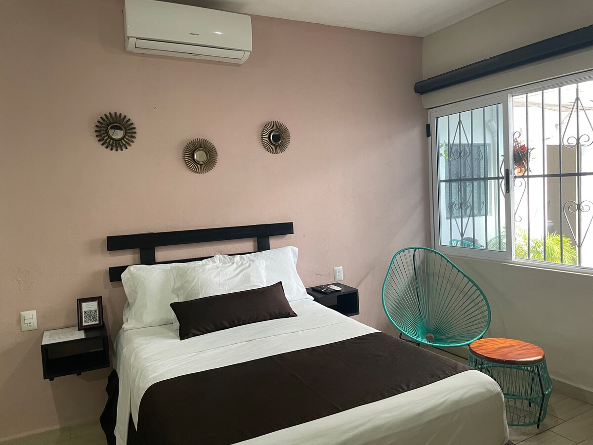 Повністю обладнана студія в невеликому приватному комплексі з 8 студій, всі з яких розроблені для того, щоб ви почувалися як удома. Розташований у центрі Плая-дель-Кармен, лише в 6 кварталах від знаменитої "5-ї Авеніди" і в 7 кварталах від прекрасних карибських пляжів. Плюс: великий супермаркет в одному кварталі, банки, аптеки, ресторани місцевої їжі по всьому світу. У нас є безкоштовна парковка за наявності. Ласкаво просимо!