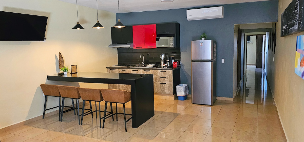 Департамент Гвадалахари / Зоопарк / Арена Гвадалахари Сучасне, комфортабельне помешкання з 2 кімнатами, де ви почуватиметеся як удома. Прогулюйтеся до зоопарку та арени Гвадалахари (обидва розташовані за 600 метрів). Розташована в дуже тихому та безпечному кондомініумі, з приватним паркувальним місцем і дахом лише для вас. 2 хвилини від швидкісних доріг, таких як периферія та Кальсада Індепенденсія. Ми виставляємо рахунок-фактуру.