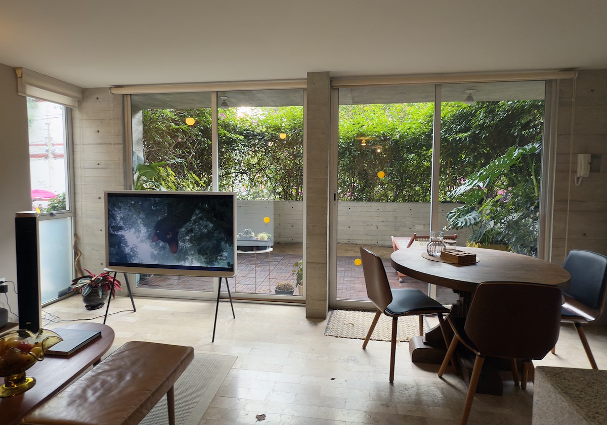 Departamento nuevo en tres niveles con espléndida vista a un bello jardín mexicano-andaluz. Dos amplías camas, dos baños completos, cocina equipada, comedor y una cómoda sala. Muy tranquilo y silencioso pues se encuentra protegido por cuatro frondosos arboles del jardín. El barrio de Santa María se ha posicionado en el gusto de la gente joven, hay una amplia gama gastronómica y es una colonia aledaña al Centro Histórico, a 10 minutos a pie del metro San Cosme, a 4 estaciones llega al Zócalo.