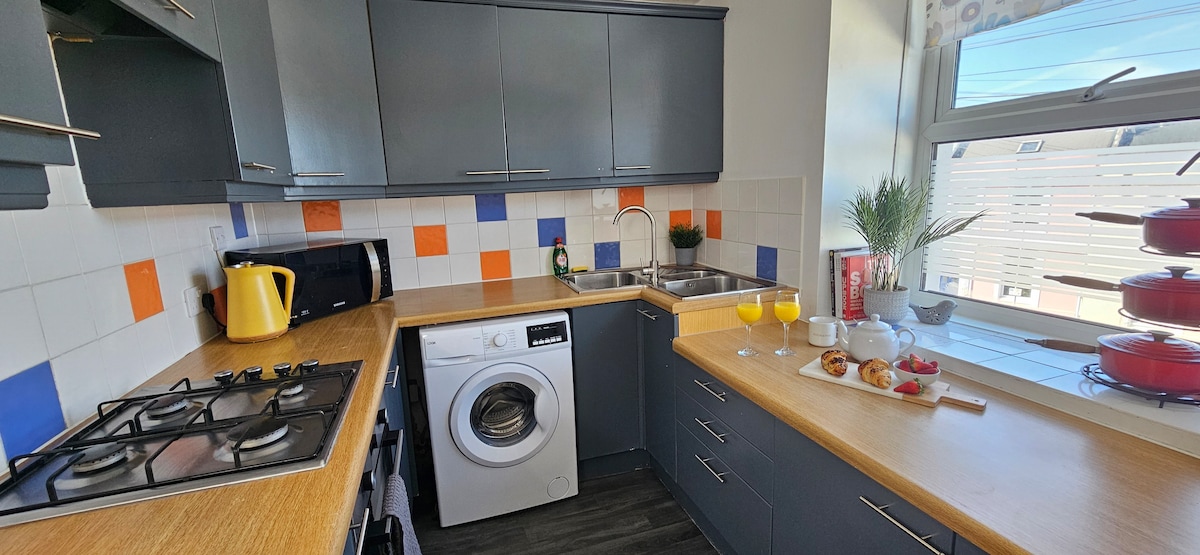**Парковка на території ** Квартира пропонує стильні сучасні інтер 'єри з просторою вітальнею відкритого планування. Кухня повністю обладнана, щоб ви почувалися як удома. З окремим балконом, який тягнеться по всій довжині квартири, і загальною сонячною терасою, є достатньо простору на відкритому повітрі, щоб насолоджуватися. Прокиньтеся і прогуляйтеся до знаменитого будиночка, щоб насолодитися морським бризом. Квартира розташована між містом і морем, що дозволяє гостям ознайомитися з усім, що може запропонувати Плімут.