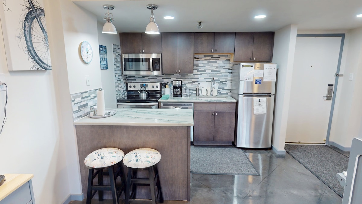 Сучасне шарм старого світу у цьому нещодавно відремонтованому кондомініумі Highland House! Насолоджуйтеся неймовірно обладнаним помешканням з багатьма унікальними акцентами в амбарі! Кухня оснащена повноцінним холодильником, посудомийною машиною, мікрохвильовою піччю, тостером, кавоваркою, індукційною плитою та розкладним столом на двох осіб. Ліжко з ефектом пам 'яті розміру «king-size» дивовижне, а на висоті 14 дюймів від землі є ідеальною висотою для зберігання невикористаного багажу.