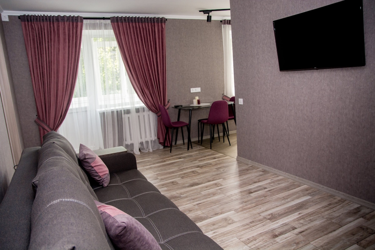Затишна, чиста та комфортна студія на центральному бульварі міста. На вас чекає велике двоспальне ліжко і диван (зручний для дитини чи дорослого) тобто квартира, буде зручна для розміщення трьох дорослих, або пари з дитиною. У нас є все для вашого комфортного відпочинку та відпочинку. Наші гості залишаються задоволені як за короткочасного перебування, так і при проживанні більше місяця.