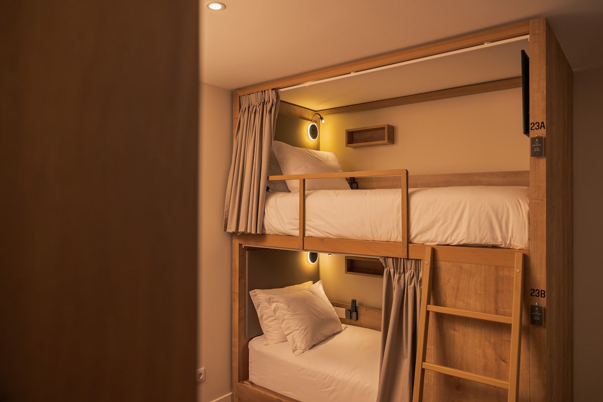 Односпальне двоповерхове ліжко, встановлене в змішаному гуртожитку з 6 ліжками, балконом та кондиціонером. На кожному ліжку є шафка (65x50x20 см), електрична розетка та світильник для читання. У спальні є окрема ванна кімната з окремим душем/гардеробною. У помешканні є такі найнеобхідніші засоби: шампунь, гель для душу, рідке мило, рушник для ванни та обличчя. Фен за запитом.