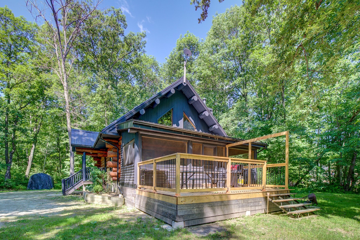 Унікальна кабіна Log Cabin - натуральне сире дерево, яке відчуває і виглядає. Дерев 'яна підлога, керамічна плитка\новий душ. Чудово підходить для зимового перебування, дров 'яна плита зберігає його дуже теплим. ПС зберігає прохолоду влітку, 3 частини ванної кімнати з новим душем, мебльована вітальня\їдальня, кухня: електрична плита\духовка, новий холодильник\морозильник, нова мікрохвильова піч, новий тостер, кавоварка, посуд, каструлі та сковорідки. Меблі для патіо, що надаються зовні, веранда з видом на річку, вогняна яма, стіл для пікніка, барбекю з пропаном. 150 акрів, ліс і стежки.