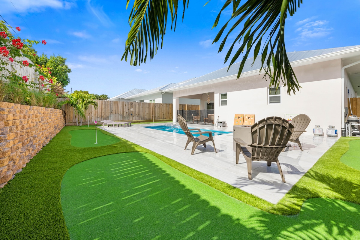 Have the vacation of your dreams in peaceful Jensen Beach! This 2100 square foot, brand new home awaits you. Come play mini golf on a custom 5-hole turf course or enjoy a decked-out game room garage, providing endless hours of fun! This home comfortably sleeps 12 and has more space than you are expecting. Swim in the brand new, heated saltwater pool or venture five minutes from home to the best beaches of Hutchinson Island. Take your much deserved vacation at the Jensen Beach Pink House!