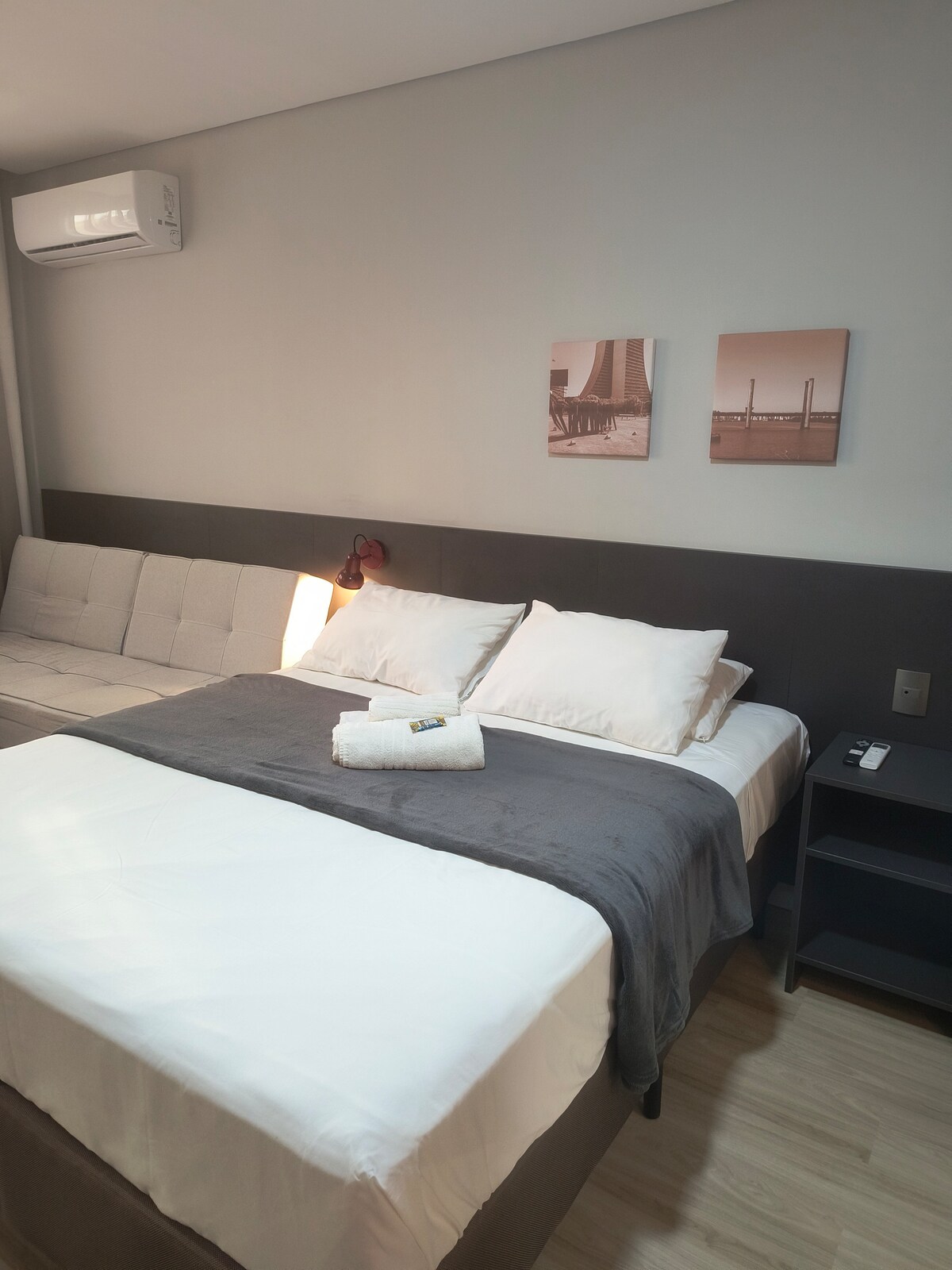 Насолоджуйтеся стильними враженнями в цьому добре розташованому помешканні. Подивіться на захід сонця в Орла-ду-Гуаїба всього в декількох кроках від місця, де ви зупинитеся. Квартира абсолютно нова, вона була розроблена, щоб служити вам з великою любов’ю. Тут є кондиціонер і послуги з прибирання з понеділка по п’ятницю. Вона обладнана основним побутовим приладдям. На кухні є холодильник, мікрохвильова піч, плита, кавоварка та сендвіч-машина. У вітальні є диван-ліжко та телевізор Smart TV. У номері є двоспальне ліжко та домашній офіс. На терасі є басейн.
