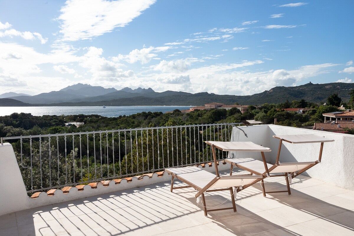 Помешкання розташоване в Residence le Rocce, обладнане вишуканими меблями та оздобленням. Оточений зеленню, він дозволяє насолодитися відпусткою мрії в контексті абсолютного спокою, релаксації, і щовечора різні кольори на заході сонця розмальовують небо. На відстані прогулянки від помешкання розташовані два головні пляжі: Порто-Соле та Кала-Баттістоні. Для шопінгу, Пьяццетта Порто Черво знаходиться в 5 хвилинах їзди, а за запитом – онлайн-уроки фітнесу та приготування типових італійських страв.