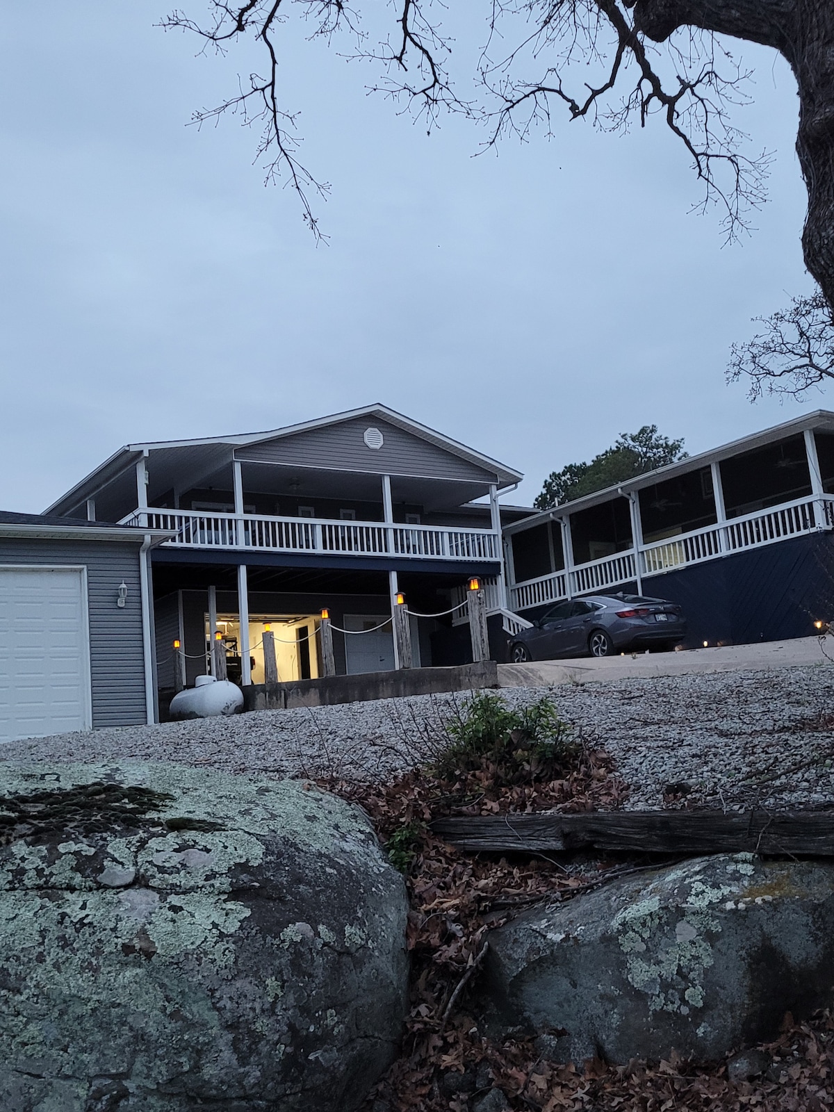 Enjoy plenty of extra room and amazing lake views at this spacious place. The house is located in Porum known for its "blue water and sandy beaches." Catch a glimpse of sunrise on the water from the deck or bedrooms. The house is minutes from Duchess Creek Marina, Chubby's, Inside out bar (food, drinks, pool tables), gas stations, and Dollar General. The house has wifi, shuffle table, fire pit, grill and plenty of sitting areas. Upon request, there is a dock you can tie up to, but no slip.