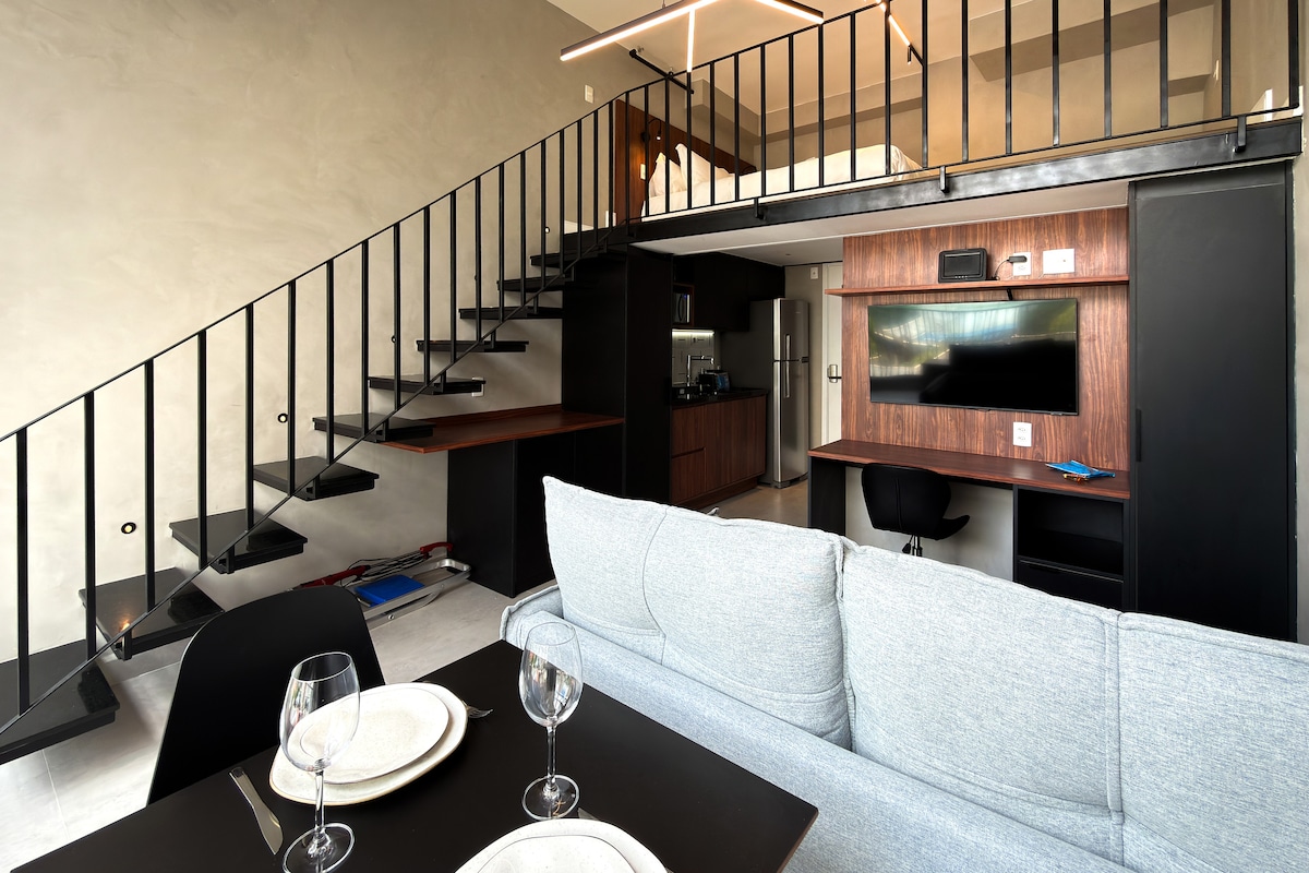 У модному районі Віла-Мадалена, на верхньому поверсі абсолютно нової будівлі West Side Studios, на вулиці Гармонія. Балкон, Wi-Fi 200 Мбіт/с, смарт-телевізор, міні-кухня з дуплексним холодильником, варильна панель з 2 конфорками, Nespresso. Ліжко Queen Size, яке, крім сліпової поверхні, розкладається на два зручних односпальних ліжка. Тренажерний зал, пральня OMO і Maleiro, а також коворкінг. 150 м від станції метро Vila Madalena. Місцеві об 'єкти з магазином OXXO, ринком Pão de Açúcar Minuto. Платна парковка перед будівлею.