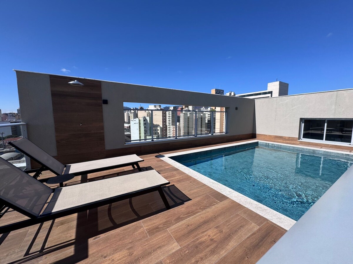 Розкішний лофт, 45 м2, кондиціонер, стіл для 4 осіб і стіл, повна та обладнана кухня, сушарка, машина. Nespresso та інші практики. Дуже просторе ліжко розміру «queen size», 1 диван-ліжко та телевізор Smart 55'c з Wi-Fi та мережею. Прекрасний вид! Загальний відкритий майданчик: повноцінний тренажерний зал, пральня, басейн з обігрівом, джакузі та сауна. Привілейоване розташування поблизу Даймонд, лікарня Матердей, Центральний ринок БХ, Суперноссо тощо. 1 місце та 24-годинні швейцари Зручності, які ви відчуваєте вдома!