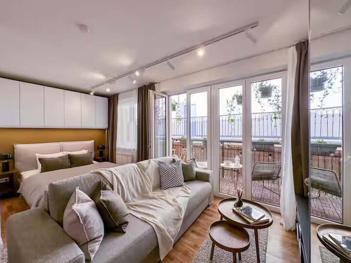 A beautiful modern airconditioned studio apartment in a renovated house in the hip Karlín neighbourhood in the centre of Prague, just at the underground station. The apartment is with high ceilings, full of light from two beautiful balcony doors, which give the flat unique atmosphere. From beautiful art to high quality memory foam mattress - everything is available for your perfect stay. Not a cheap Airbnb flat, but a designed home: fully equipped and full of quality materials.