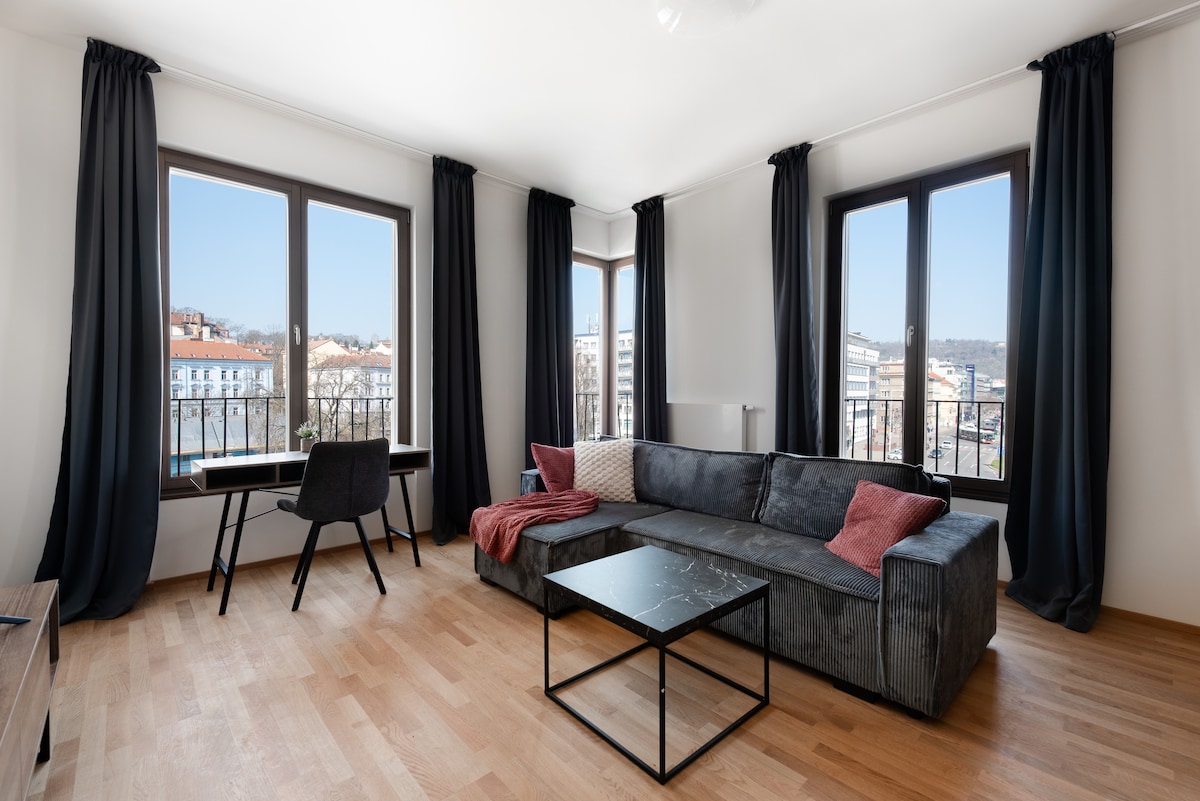 Затишна світла квартира в центрі Праги з видом на Вацлавську площу. Поруч є всі послуги, магазини, ресторани та бари. Перед будинком розташована трамвайна зупинка, яка веде безпосередньо до центру або до головного залізничного вокзалу біля будинку. Перед будинком також є платна парковка. Квартира знаходиться в 200 м ходьби від Національного музею або Вацлавської площі і повністю обладнана побутовою технікою. Протягом усього перебування також є безкоштовний Wi-Fi.