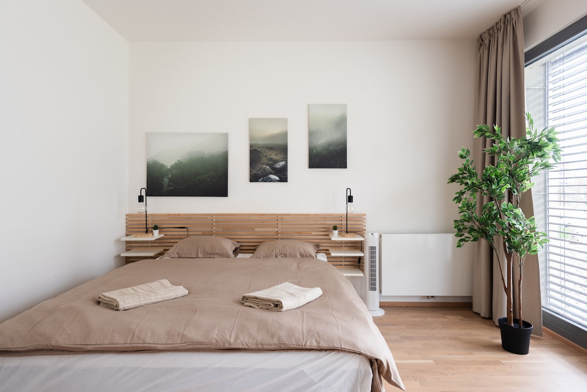 Розкішна студія площею 65 кв. м (45 + 20 приватний балкон із мальовничим видом на пагорб) — це нульовий рівень для елегантної вишуканості; промисловий тон і розкішні зручності — найунікальніший архітектурний проєкт у Чехії! Відпочиньте в 20-метровому закритому басейні, сауні, тренажерному залі, масажному кабінеті та кінозалі Лофт на верхньому поверсі з окремою кімнатою для медитації/йоги Справжнє ліжко king-size з товстим матрацом і простирадлами; повна кухня Зручно розташовано на автобусній зупинці (U Belarie) 10 хвилин пішки до ресторану на березі річки