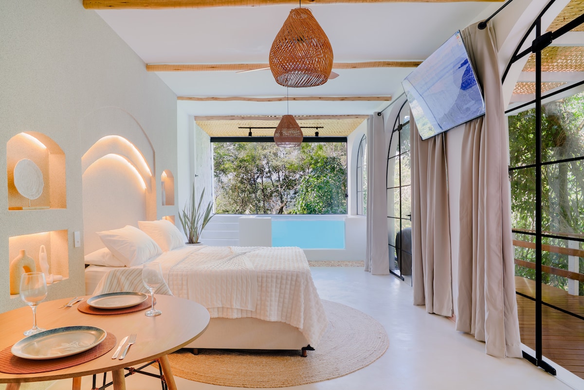 Унікальний прихисток у Ріо! Вілла площею 50 кв. м із пальмових листя посеред тропічного лісу, повністю інтегрована з природою. Всього за 20 хвилин від пляжу Леблон, є затишна кімната, кухня, ванна кімната та тераса з двома сітками. Спільний басейн, стежки, водоспади та приголомшливі види доповнюють враження. Ідеально підходить для тих, хто шукає відпочинку, пригод та безпосереднього контакту з зеленню, не відмовляючись від близькості до міста.