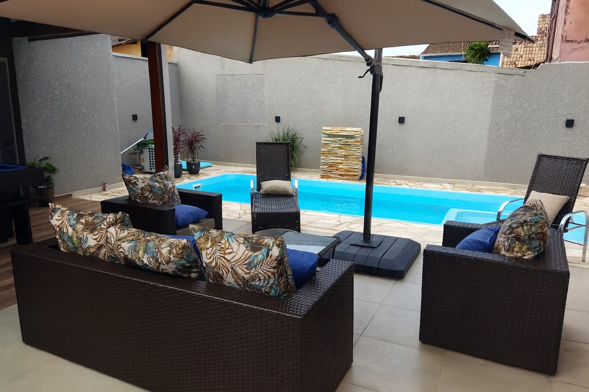 Будинок у Балнеаріо-Санта-Терезіна, Понтал-ду-Парана, за 500 метрів від пляжу. Він має великий приватний басейн (8×4 м), великий двір з місцем для 3 автомобілів, барбекю та відкриту зону, що ідеально підходить для сімей. Є 3 спальні, 1 з кондиціонером, 2 ванні кімнати, вітальня з телевізором, Wi-Fi, повністю обладнана кухня, пральна машина та праска. Доступні шезлонги, пляжна парасолька та намет. Тихе та зручне для сімейного відпочинку помешкання, ідеальне для відпустки, Різдва та Новорічних свят