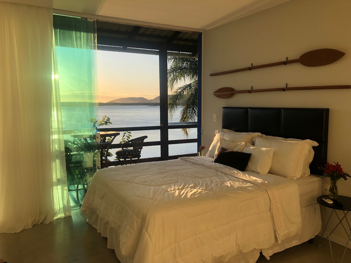 Природна обсерваторія високо на горі з архітектурою в симбіозі з природою. Приголомшливий вид на лагуну та море, зі сходом сонця та місяця. Фогейра, щоб побачити зірки. Комфорт, вишуканість і приватність. В оточенні Атлантичного лісу, вод водоспаду, природного басейну з джерельною водою. Доступ лише на човні (красивий маршрут через води Лагоа — приблизно 15 хв) або через стежку. Зареєструйте прибуття особисто. Рай чекає!