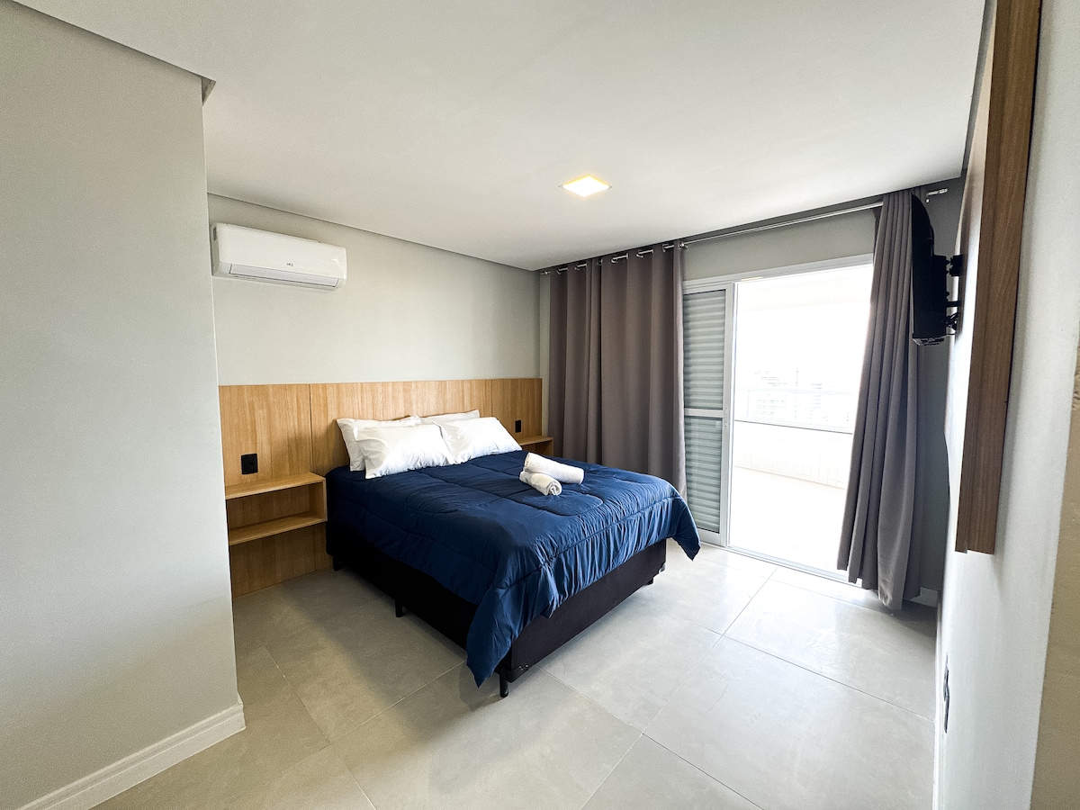 New apartment by the sea in Praia Grande, with incredible views, ideal for up to 5 guests. There are 2 air-conditioned suites, bathrooms with hairdryer, a toilet, fully equipped kitchen, two SmartTVs, terrace and high-speed Wi-Fi. The master suite has a Smart Projector and home office space. Close to McDonald's, the bus station, bakeries, ice cream parlors, restaurants, markets and conveniences, all within walking distance. It has a washing machine and 1 parking space.