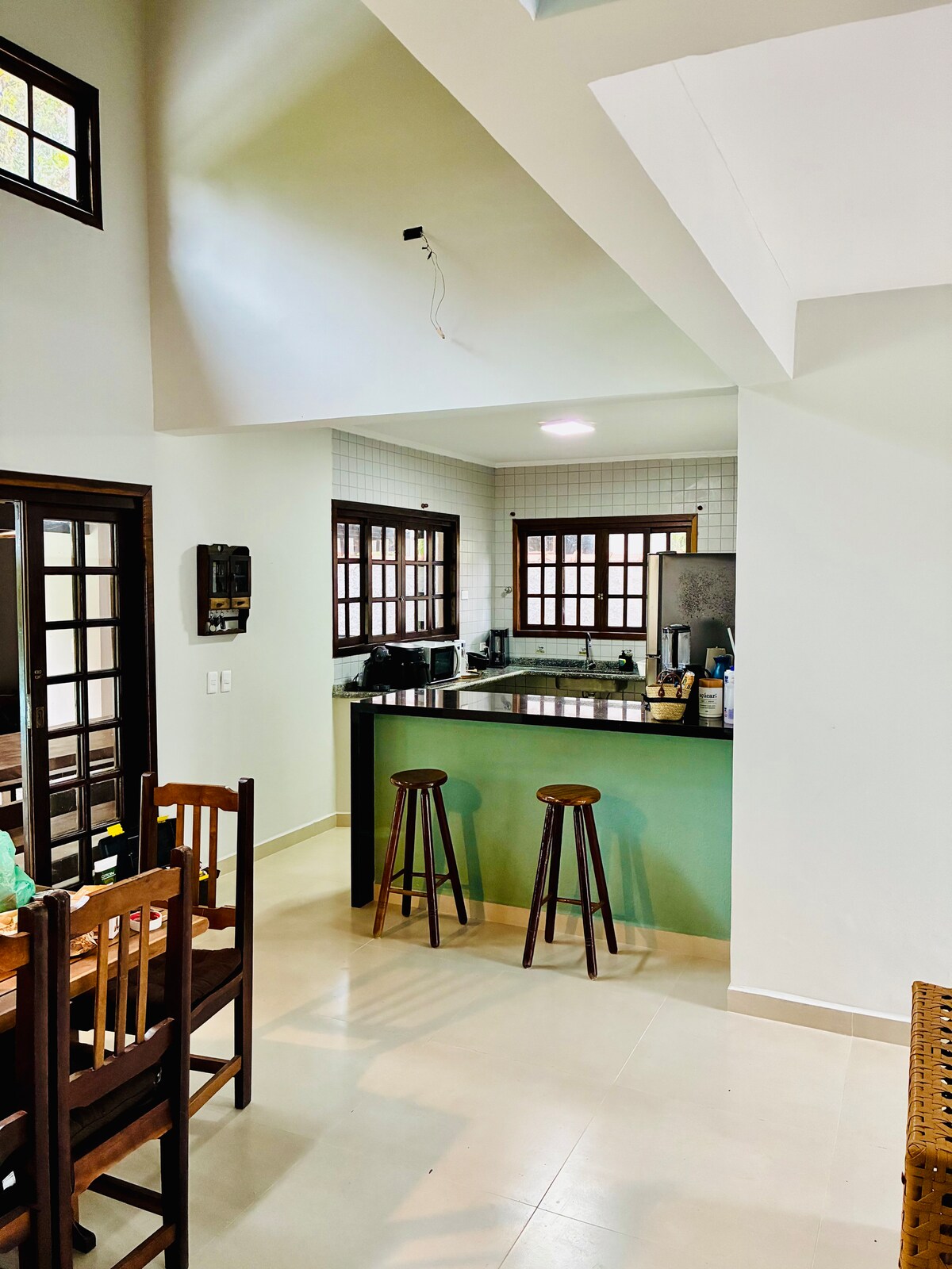 Comfortable and welcoming house located in the Costa do Sol Condominium, just 450 mts from Guaratuba Beach. This is the “mini” version of the house, featuring 2 suites, each with a cozy mezzanine. The property offers a spacious kitchen integrated with the dining area, a gourmet space with pizza oven and barbecue, plus a solar-heated pool and garden. Perfect for a family vacation in a quiet and safe environment. Note: the full version of the house (4 suites), is also available on our profile.