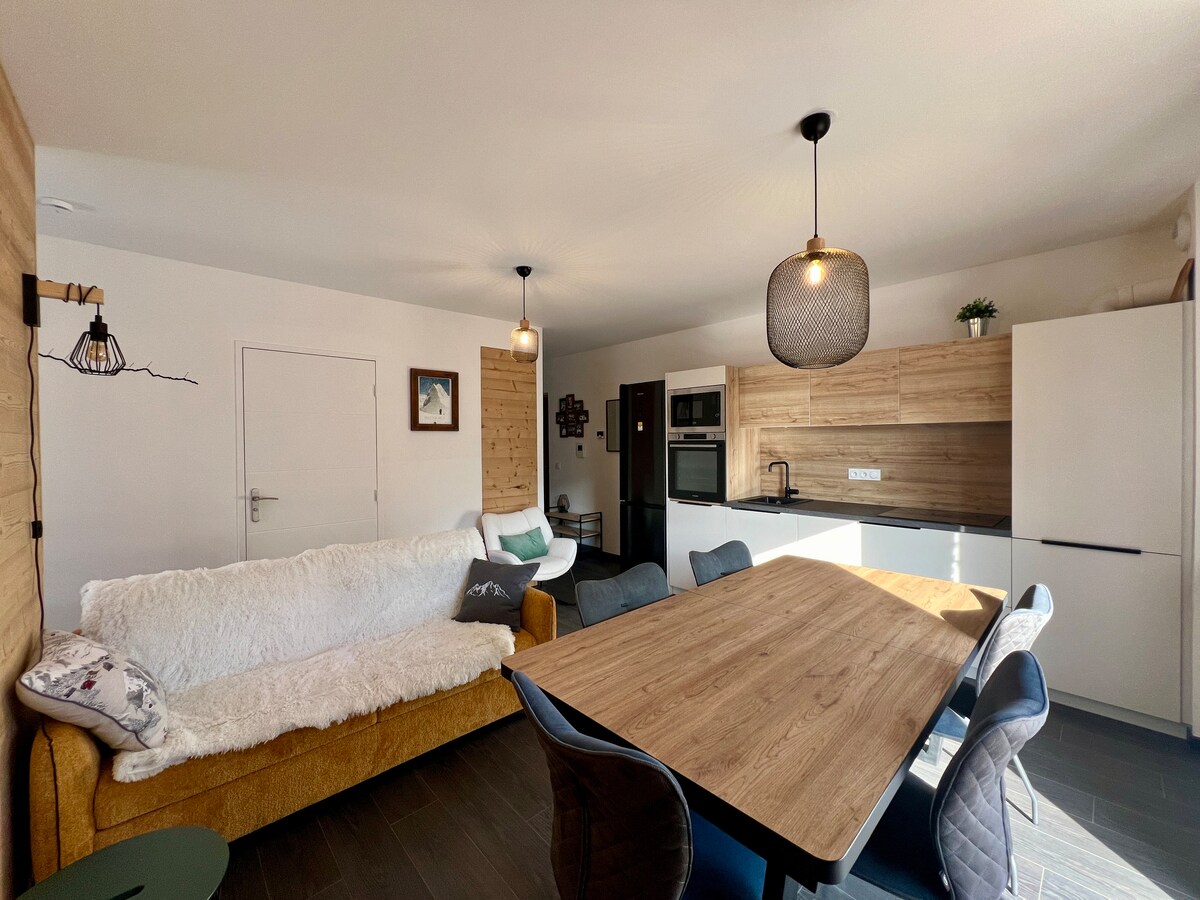 У нещодавній резиденції з 1 окремою спальнею та 1 гірським кутом. 200 м від центру села та гірськолижних пагорбів Ідеально підходить для пар і сімей з двома дітьми Вітальня з швидким диваном-ліжком, телевізор, кухня (холодильник, посудомийна машина, комбінована мікрохвильова піч, кавоварка, чайник, тостер, послуги ракетки...) Спальня 140x190 Гірський куточок з двоярусними ліжками Ванна кімната з душем Окремий вид на балкон із туалетом на гору Шарвін Дитячі ігрові зони 100 м + озеро для плавання