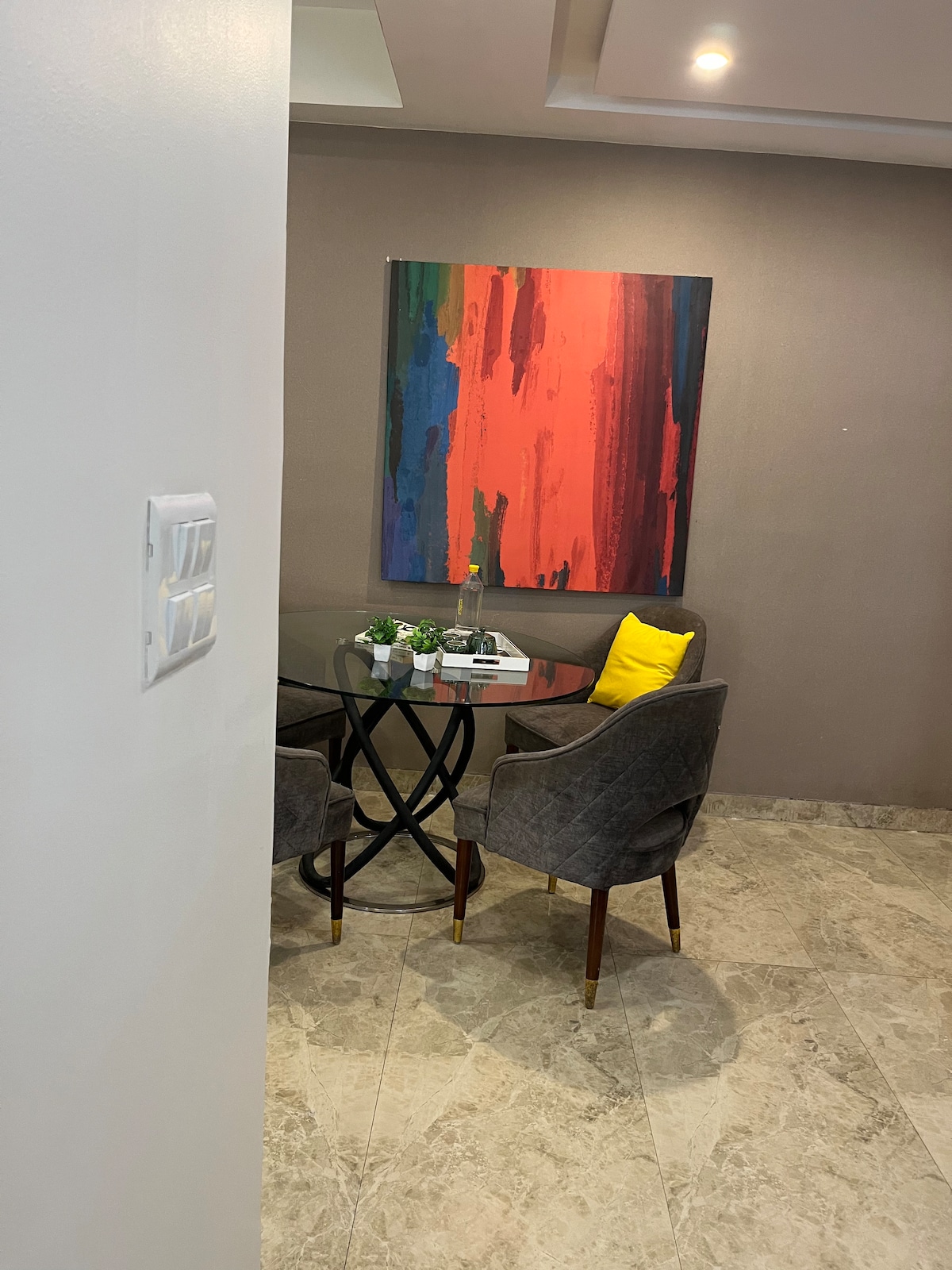 Візьміть з собою всю сім 'ю до цього чудового місця, розташованого в центрі міста, з багатьма місцями для розваг. Це одна з найновіших красивих будівель, розташована в 2 хвилинах ходьби від храму ISKCON, а також Прем Мандір і з легким доступом до туристичних місць Вріндавану. Це низькоповерхова квартира з безкоштовною парковкою на нижньому першому поверсі разом із ліфтом. Багато вуличної їжі та фірмовий ресторан поруч з можливістю доставки їжі до дверей, хоча ця квартира має обладнану кухню, якщо ви хочете готувати самостійно.