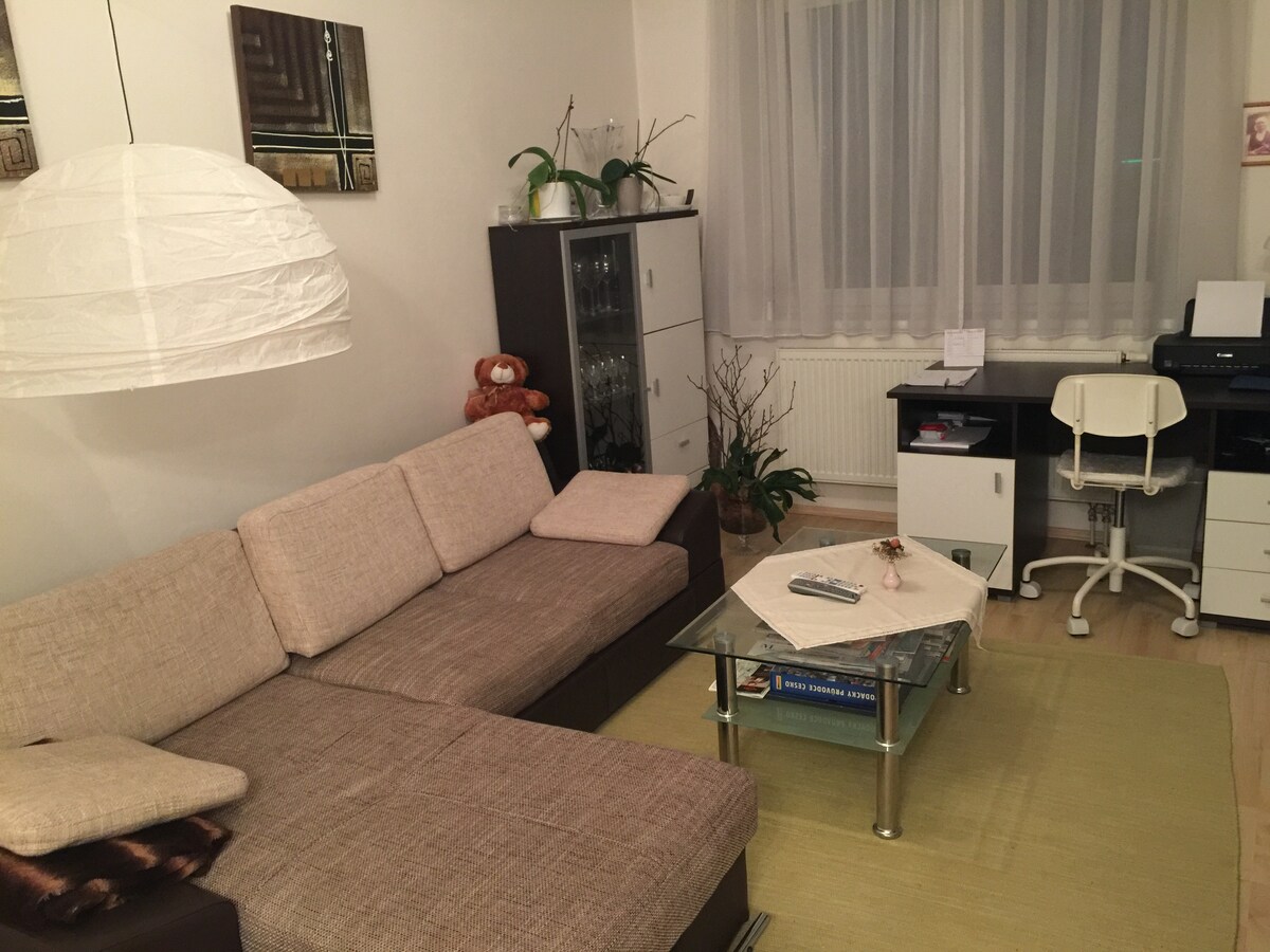 Malý moderní útulný byt s balkonem a projektorem s Netflixem. Byt se nachází v klidné čtvrti obklopený nádhernou přírodou. Byt není v centru, cesta do centra trvá cca 30 minut, doprava je ale dobře dostupná (autobus, vlak, tramvaj). Díky tomu je ale okolí bytu naprosto klidné a ideální na procházky do přírody, na dosah bytu je několik krásných přírodních míst. K bytu je zadarmo soukromé parkovací stání.