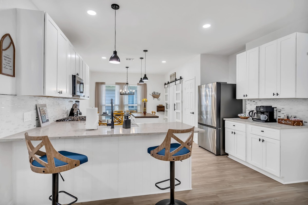 Have fun with the whole family at this stylish 3-bedroom home in the heart of Prosper, a charming town filled with shops, dining, and local attractions. This brand-new, thoughtfully designed home offers modern finishes, comfortable living spaces, and a spacious backyard perfect for relaxing or playing with the kids. Stylish furniture, fast WiFi, and large smart TVs ensure both comfort and entertainment for all. Please note: no parties or loud noise to maintain a peaceful stay.